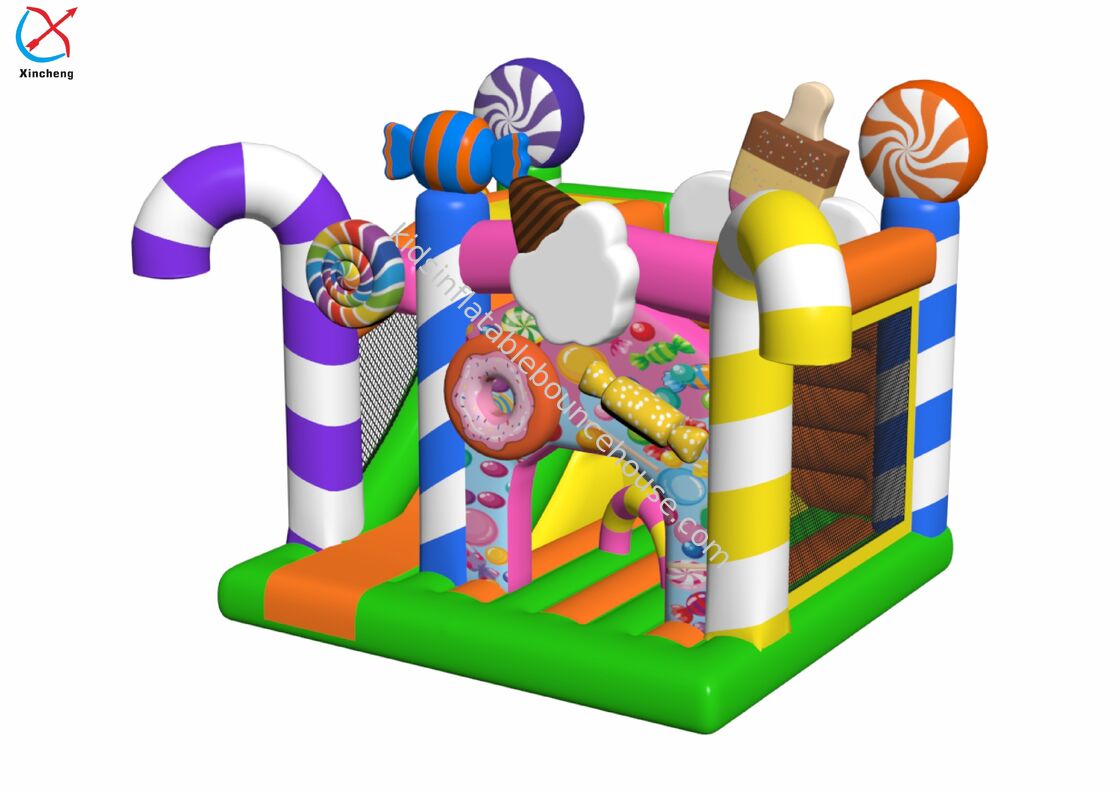 Коммерческий надувный прыгающий замок с яркой темой сладостей, с интегрированным слайдом для повышения игровой ценности и развлечения.