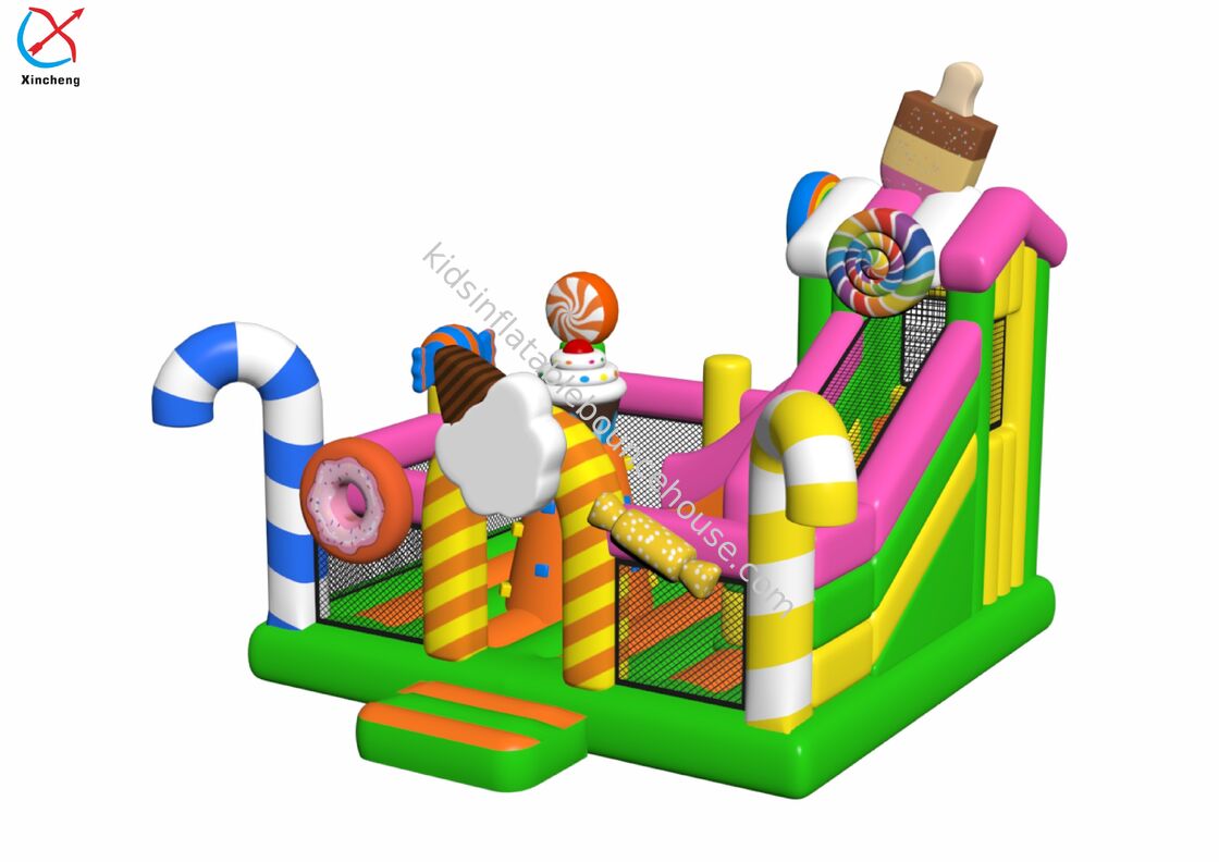Надувной замок коммерческого класса с яркой конфетной тематикой и встроенной горкой для повышения игровой ценности и развлечения.