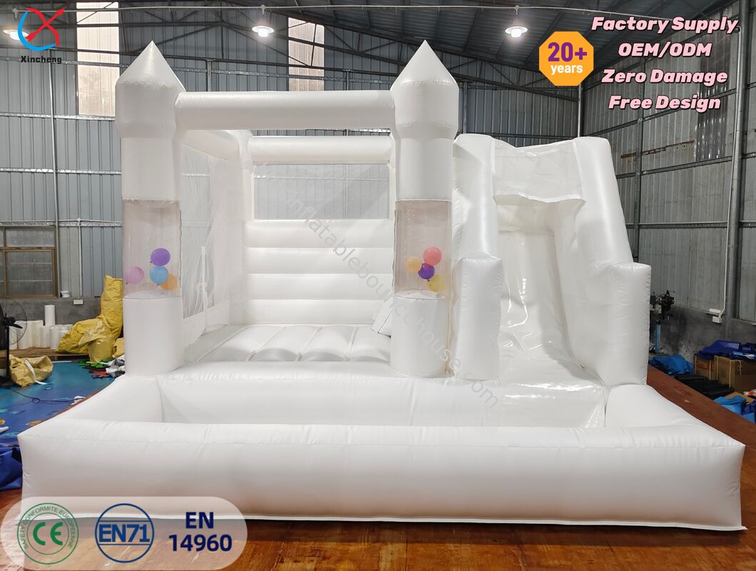 Этот элегантный белый надувный дом с свадебной тематикой имеет встроенную горку, создавая сложное развлекательное решение для свадебных вечеринок и праздников.Конструкция коммерческого класса обеспечивает безопасное прыжка и скольжение веселье для гостей всех возрастов.